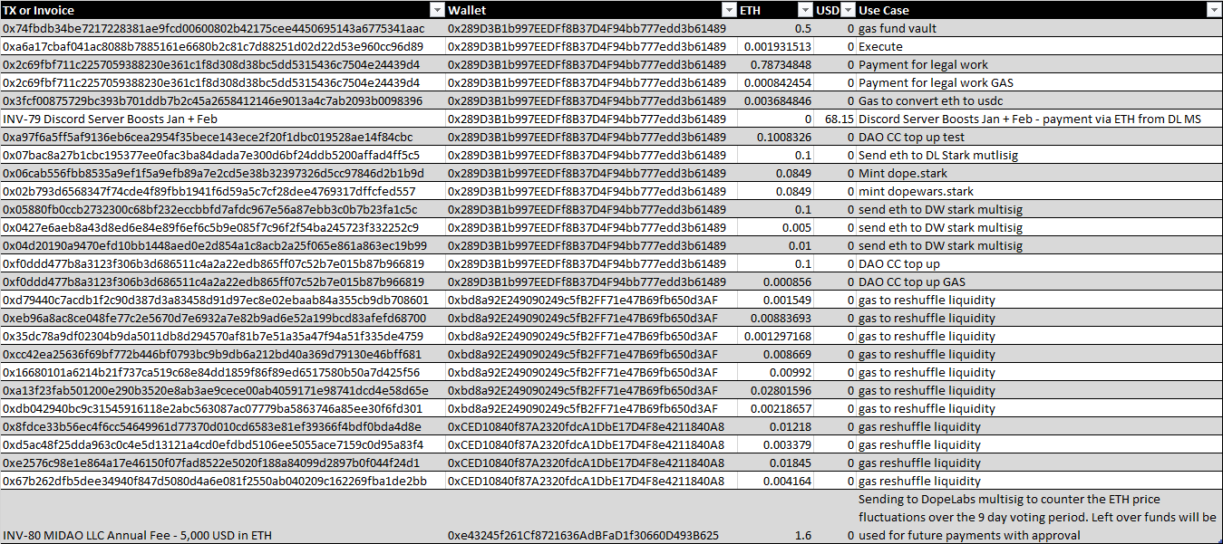 Below is a table of the DAO Operating Expenses by members of the DAO/DopeLabs