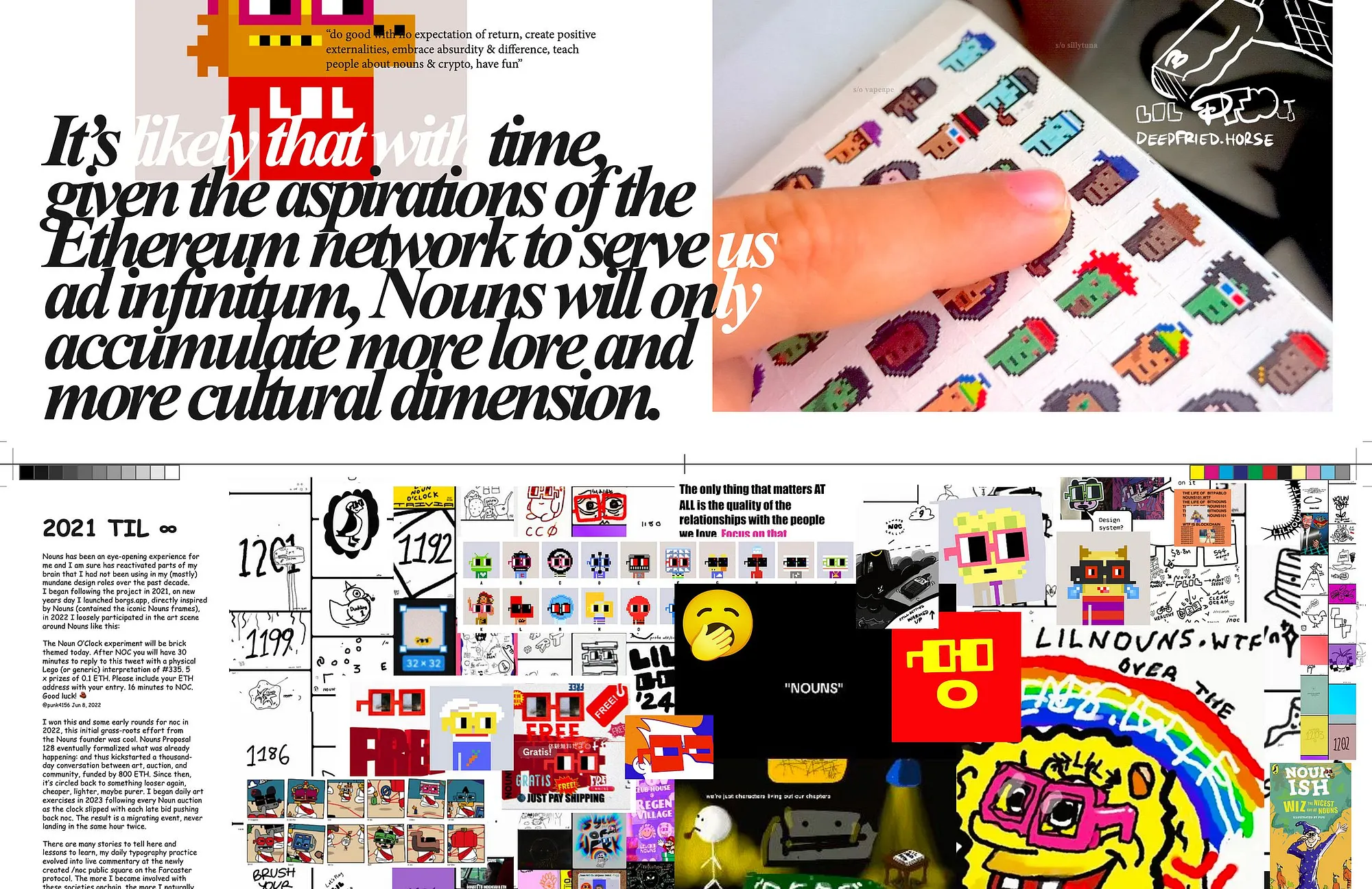 Below are links to “MEME VALUE”, a book I made for Lil Nouns. This looks at Nounish DAOs from within, capturing a moment in time (limited edition launched 8/8/25 & now distributing digital copies for free). Hopefully people will enjoy reading/printing/sharing. I enjoyed making this, and am working on other similar documents that collate open source/cc0/copyleft projects/art/experiments beyond my own.