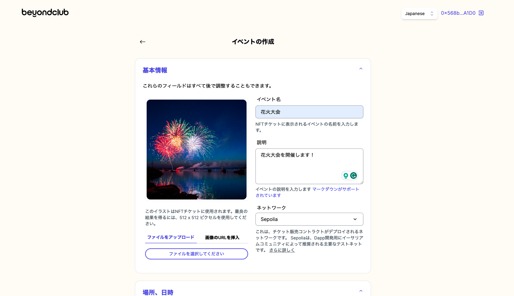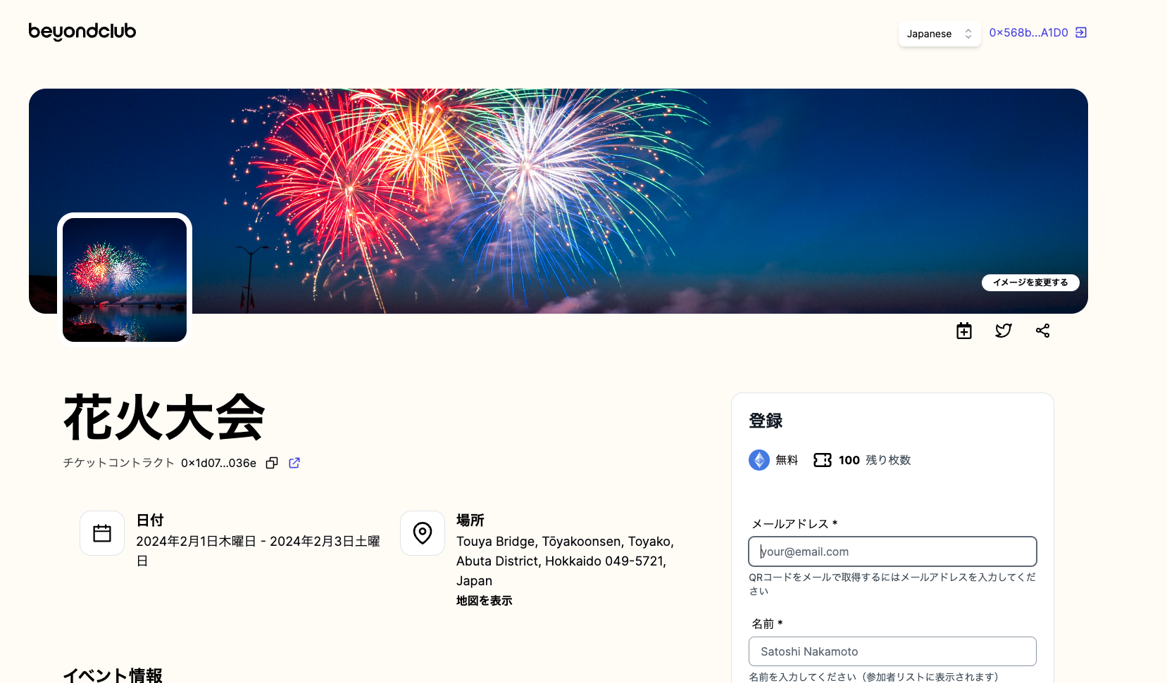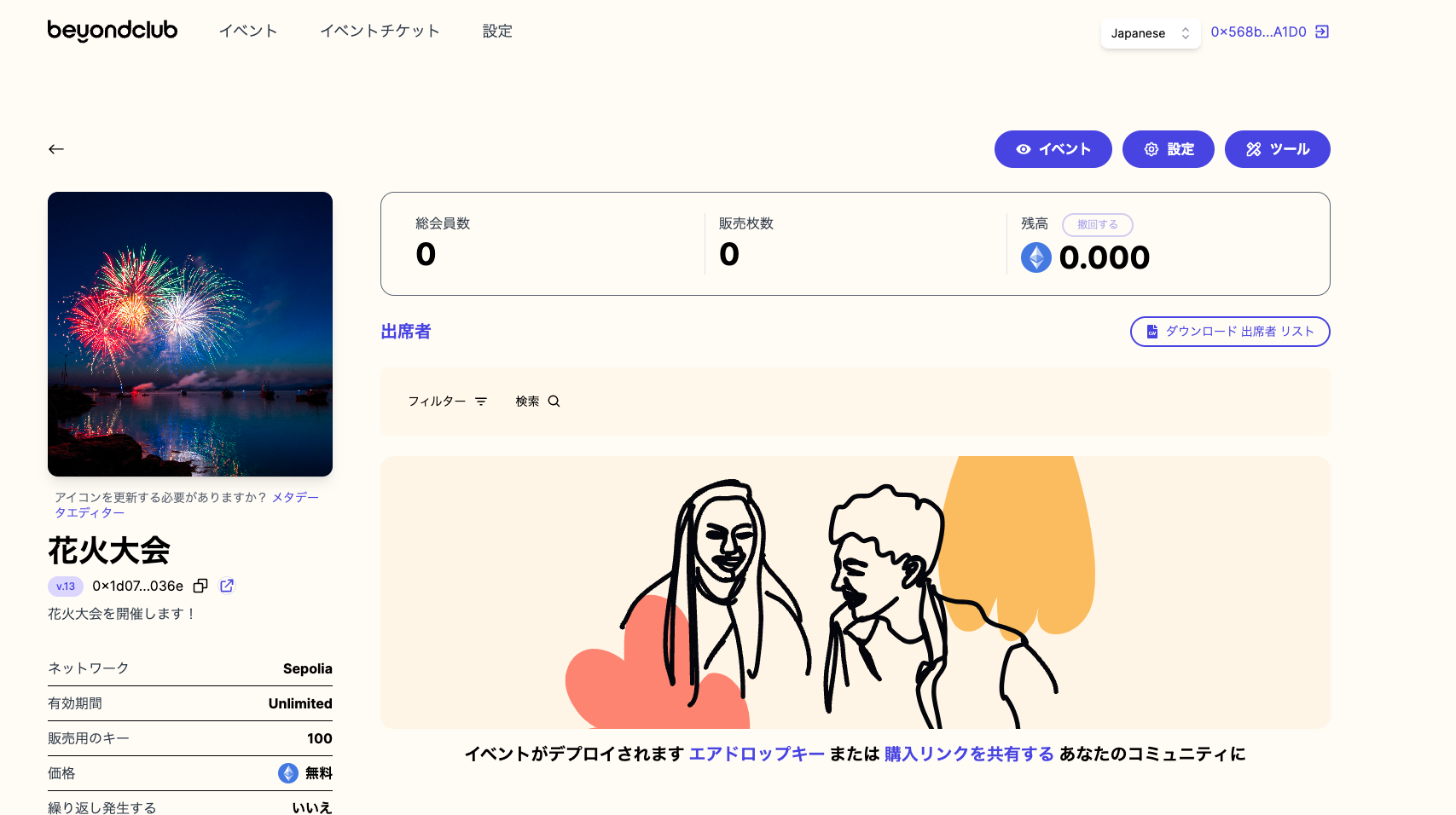 This is the sample event page. https://ticket.beyondclub.xyz/ja/event?lockAddress=0x1d07b78ee5a7dd82894ac8e94c284adf0c6e036e&network=11155111